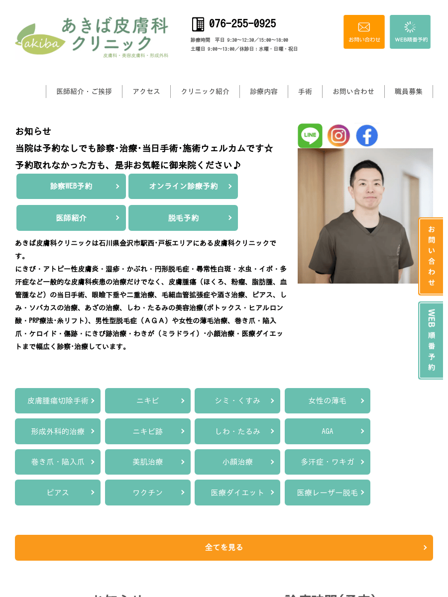 あきば皮膚科クリニック平日 9:30~12:30/15:00~18:30、土曜 9:00~13:00、休診: 水・日・祝金沢市戸板のあきば皮膚科クリニックは男性AGAの内服治療や女性の薄毛に対する内服・外用治療に対応し、当日診察・処置やオンライン診療を導入して継続しやすさを重視している点が選ばれる理由です。料金(税込) -詳細を見る公式サイトを見る