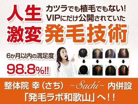発毛ラボ 和歌山火・金: 09:00~12:00 / 15:00~19:00、水・木・土: 09:00~12:00発毛ラボ和歌山は日本臨床再生医療学会認定の100%ヒト幹細胞培養液をフリーズドライ原液で導入し、針を使わないエレクトロポレーションで薬に頼らない発毛を目指す和歌山市内唯一の専門院です。料金(税込) -詳細を見る公式サイトを見る